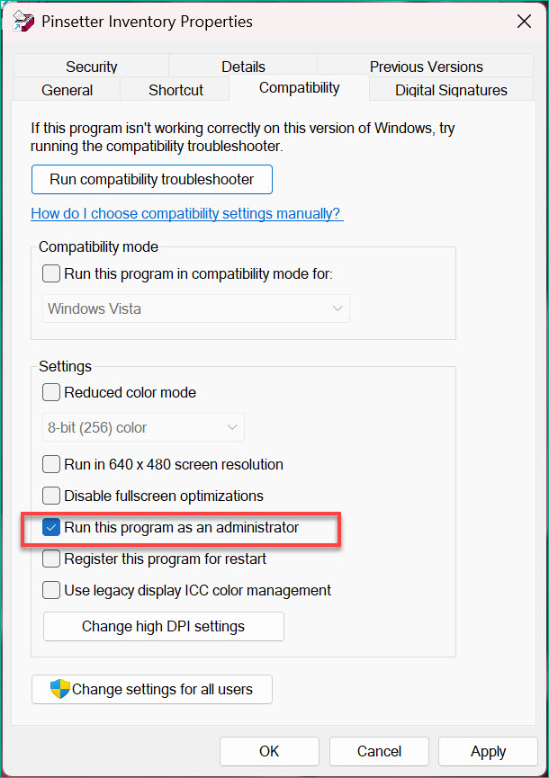 When the next window is displayed, click the compatibility tab, then check the box that says “run as administrator”.